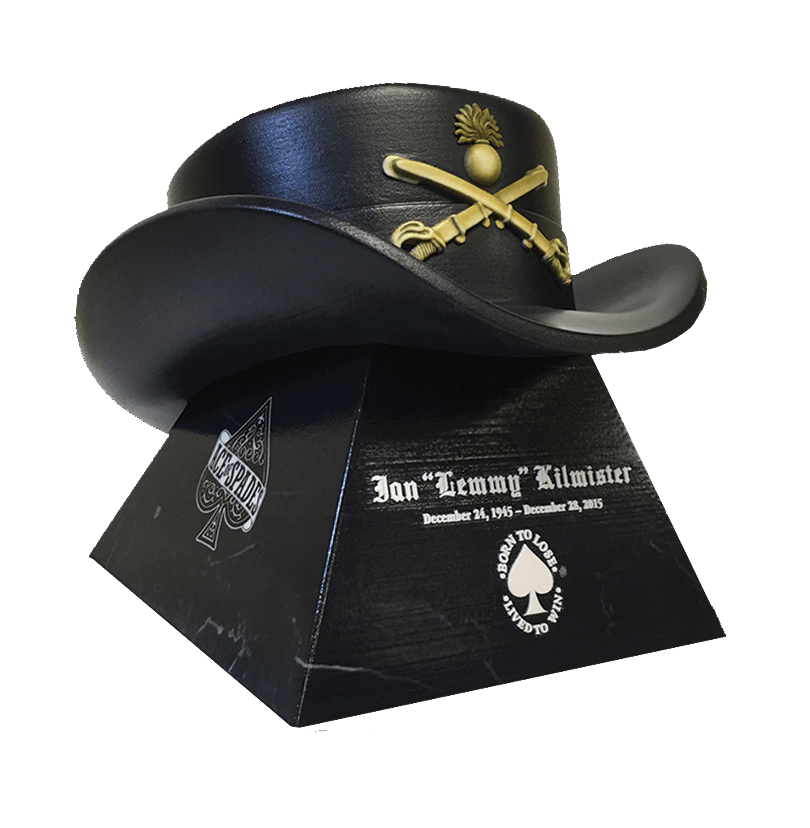 During the planning process, both Lenny’s family and bandmates had expressed interest in designing a creative urn that would showcase Lemmy’s hard-rock lifestyle and music. It was decided that his cavalry hat, a key performance staple, should be the foundation of the urn’s design