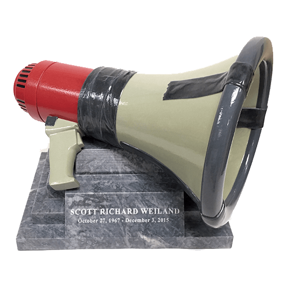 One of Scott Weiland’s enduring artistic choices was to sing through a megaphone while on stage with his band Stone Temple Pilots. To pay tribute, his family commemorated him with an urn in the shape of his favorite, and now legendary, megaphone.
